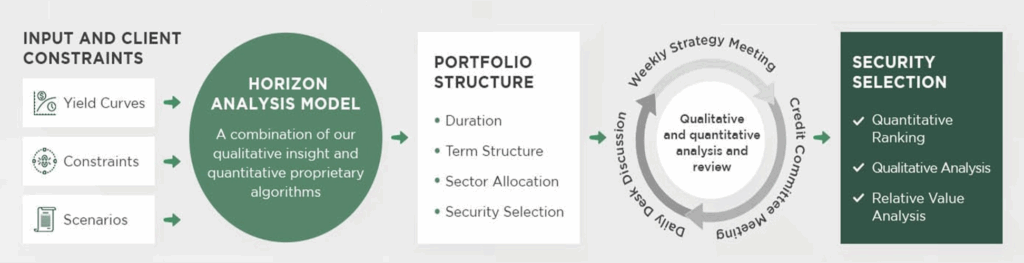 Proprietary quantitative Horizon Analysis Model suggests target duration, sector allocation and term structure.